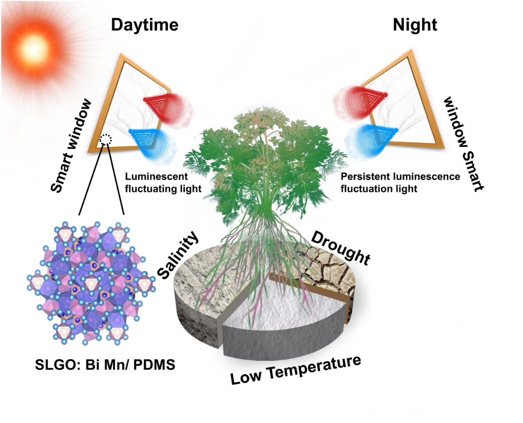 基于以上背景,生物物理研究院许士才教授带领团队,开发了一种具有持久发光与光激励发光特性的Sr₃Lu₂Ge₃O₁₂: 0.05%Bi³⁺, 0.03%Mn²⁺纳米荧光粉/聚二甲基硅氧烷多功能智能窗。该窗体在日光激发下白天产生红蓝混合波动光,夜间通过持续释放储存的光能发出红蓝混合余辉波动光。这种波动光环境可降低光呼吸效应,红蓝光通过协同作用提升光合效率并加速植物生长。在盐碱、干旱及低温胁迫条件下对豌豆的试验表明,其生长指标与抗逆性指标均得到改善,证实了植物抗逆能力的提升。该技术使植物在胁迫环境中茁壮生长,有效解决产量问题,从而增强农业生产系统的稳定性与经济效益。相关成果以A Multi-functional Smart Window for Converting Sunlight into Absorbable Fluctuating Light to Enhance Plant Growth and Stress Tolerance为题目发表在Advanced Functional Materials上(IF 19,一区TOP期刊)。