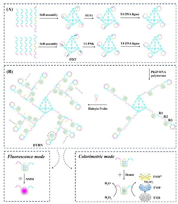 DNA修复酶在维持基因组稳定性中发挥关键作用,其活性异常与癌症发生、耐药及预后密切相关,已成为重要的疾病生物标志物。现有检测方法局限于单模式检测,不利于检测结果的交叉验证和准确性提升。为此,研究团队提出了一种DNA四面体发射的纳米网络,用于两种DNA修复酶活性的双模式检测。该策略以DNA四面体纳米探针为核心,在DNA修复酶催化瓣状切割和磷酸化反应后,触发多级级联滚环扩增反应,生成纳米网络。纳米网络的生成将荧光信号有效聚集,进一步提高荧光检测模式下的灵敏度;同时利用纳米网络的催化特性,将TMB有效催化,产生可检测的比色信号。该研究工作提出的双模式检测策略,通过荧光信号聚集与比色信号催化的协同互补,显著提升了对癌症相关生物标志物的灵敏度和检测范围的适应性。